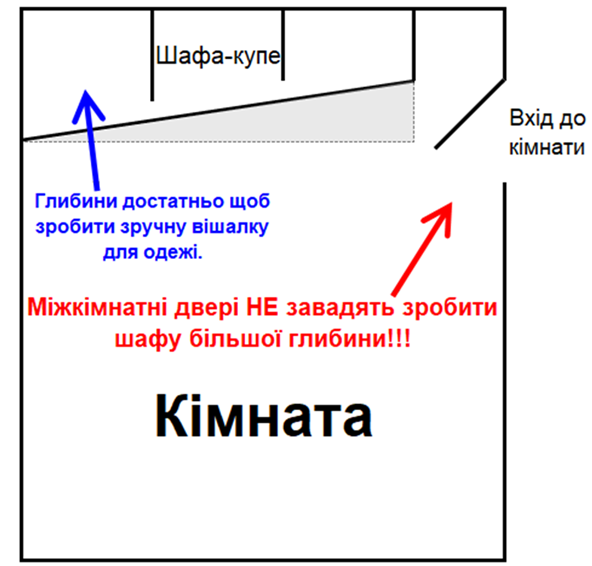- Можливість установки в складних умовах, де пряма шафа просто нерозумна. Бувають ситуації, коли пряма шафа зі зручною глибиною для вішання одягу не виходить зробити через міжкімнатних дверей або інших факторів. Тому залишається вихід тільки з шафою навскіс.